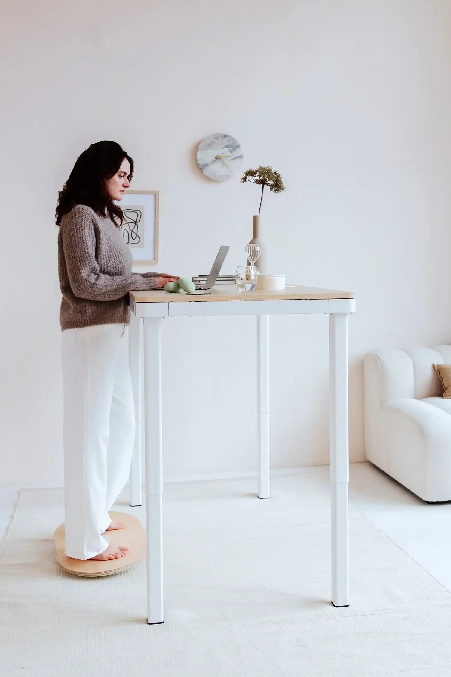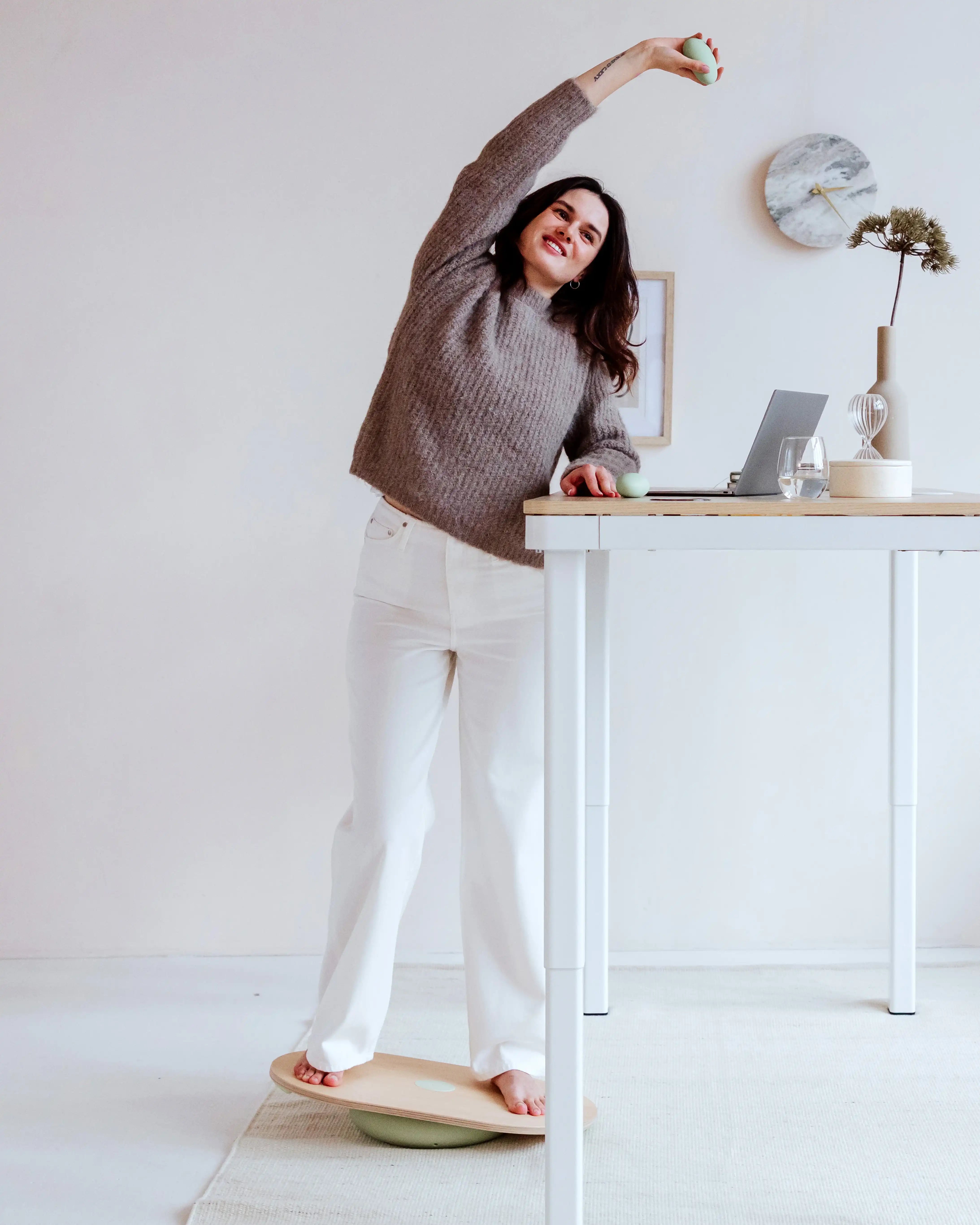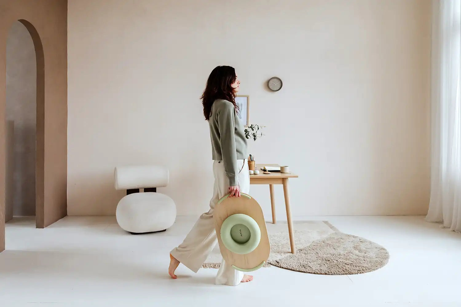 VLUV VIPPA is een veelzijdig balansbord van hoogwaardig berkenhout met luchtvering voor op kantoor, in het thuiskantoor en thuis, dat actief en gezond staan bevordert. Door zachte balans-, loop- en draaibewegingen activeert VIPPA de bloedsomloop en traint het de voet-, been- en bekkenspieren. Fascia en banden worden gestrekt, balans en concentratie worden bevorderd.